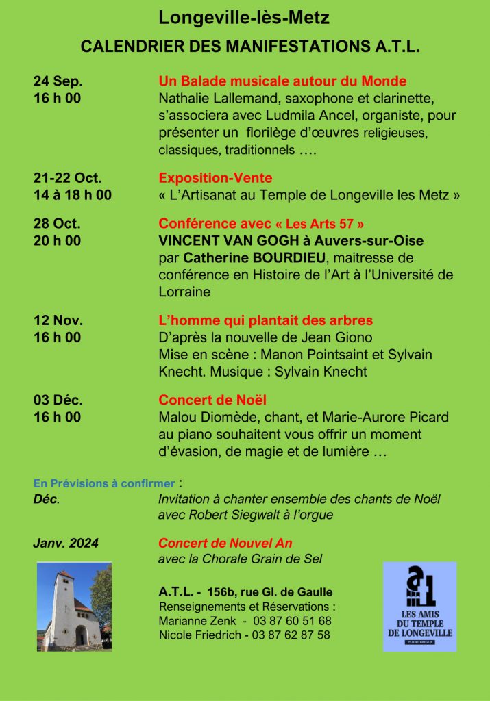Le patrimoine chez nos voisins Posté le 31 octobre 2024 par Anne-Marie En Pays messin, et ailleurs… L’agenda des acteurs de l’histoire et du patrimoine en Grand Est (Lien) La Sixtine de la Seille (peintures de l’église de Sillegny) Lorry-lès-Metz au fil du temps – Les annonces des associations