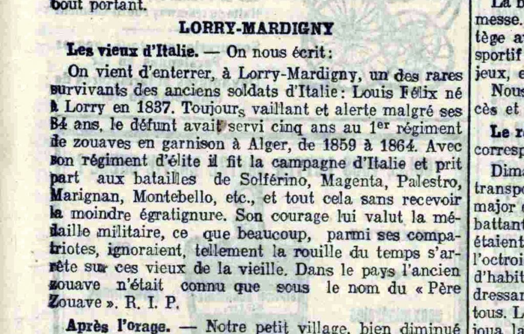 On vient d’enterrer, à Lorry-Mardigny, un des rares survivants des anciens soldats d’Italie : Louis Félix, né à Lorry en 1837. Toujours vaillant et alerte malgré ses 84 ans, le défunt avait servi cinq ans au 1er régiment de zouaves en garnison à Alger, de 1859 à 1864. Avec son régiment d’élite il fit la campagne d’Italie et prit part aux batailles de Solferino, Magenta, Palestro, Marignan, Montebello, etc., et tout cela sans recevoir la moindre égratignure. Son courage lui valut la médaille militaire, ce que beaucoup, parmi ses compagnons, ignoraient, tellement la rouille du temps s’arrête sur ces vieux de la vieille. Dans le pays l’ancien zouave n’était connu que sous le nom du « Père Zouave ». R.I.P. (Requiescat in pace : qu’il repose en paix)