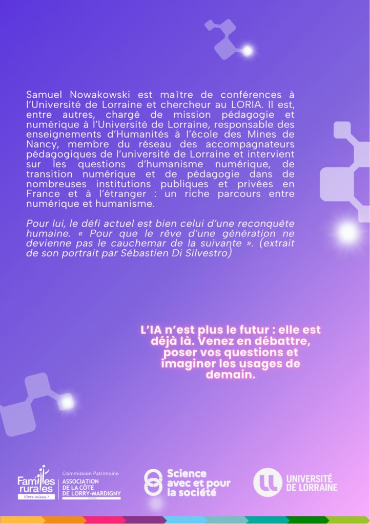Samuel Nowakowski est maître de conférences à l’Université de Lorraine et chercheur au LORIA. Il est, entre autres,chargé de mission pédagogie et numérique à l’Université de Lorraine, responsable des enseignements d’Humanités à l’école des Mines de Nancy, membre du réseau des accompagnateurs pédagogiques de l’université de Lorraine et intervient sur les questions d’humanisme numérique, de transition numérique et de pédagogie dans de nombreuses institutions publiques et privées en France et à l’étranger : un riche parcours entre numérique et humanisme.