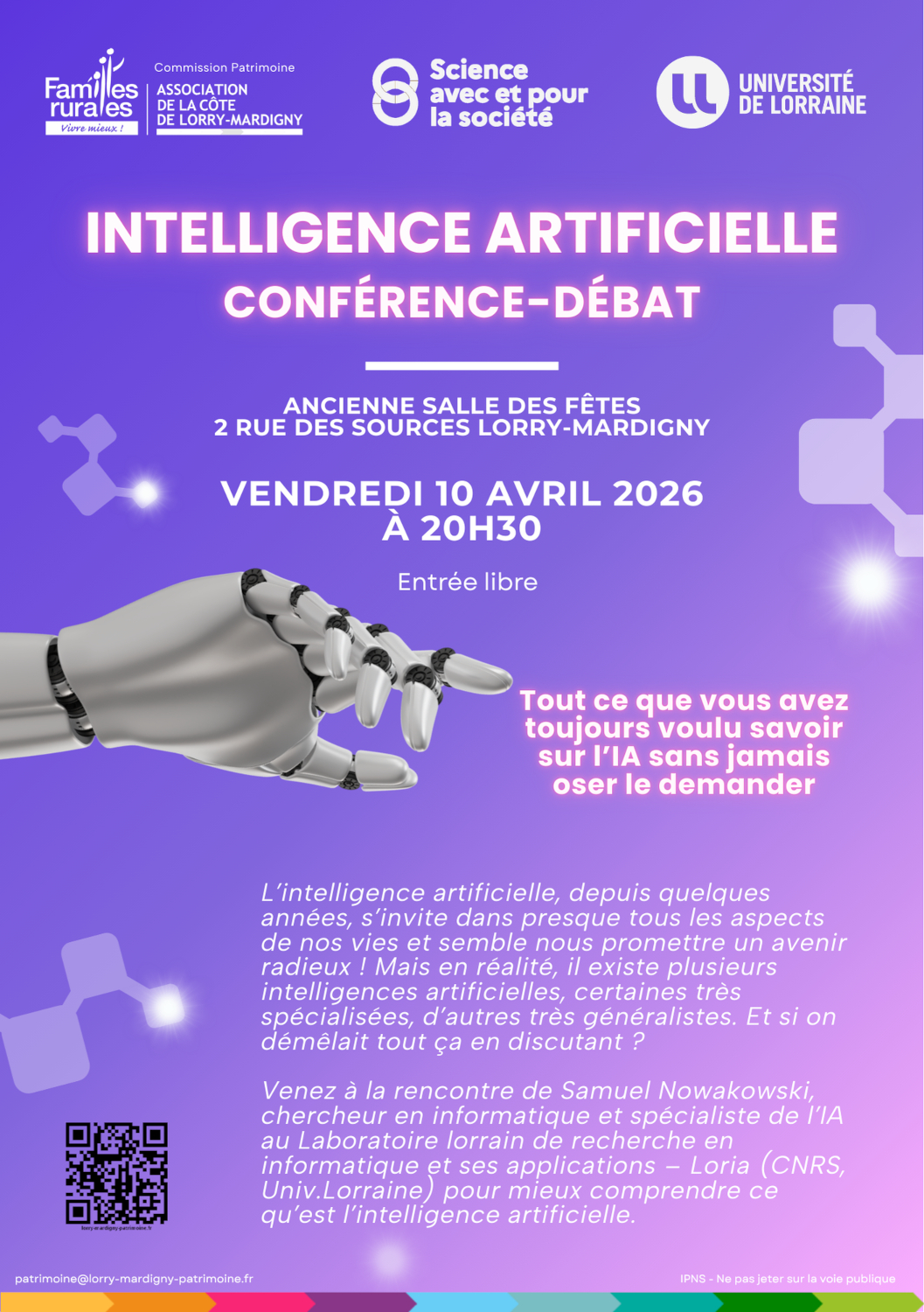 L’intelligence artificielle, depuis quelques années, s’invite dans presque tous les aspects de nos vies et semble nous promettre un avenir radieux ! Mais en réalité, il existe plusieurs intelligences artificielles, certaines très spécialisées, d’autres très généralistes. Et si on démêlait tout ça en discutant ? Venez à la rencontre de Samuel Nowakowski, chercheur en informatique et spécialiste de l’IA au Laboratoire lorrain de recherche en informatique et ses applications – Loria (CNRS, Univ.Lorraine) pour mieux comprendre ce qu’est l’intelligence artificielle.