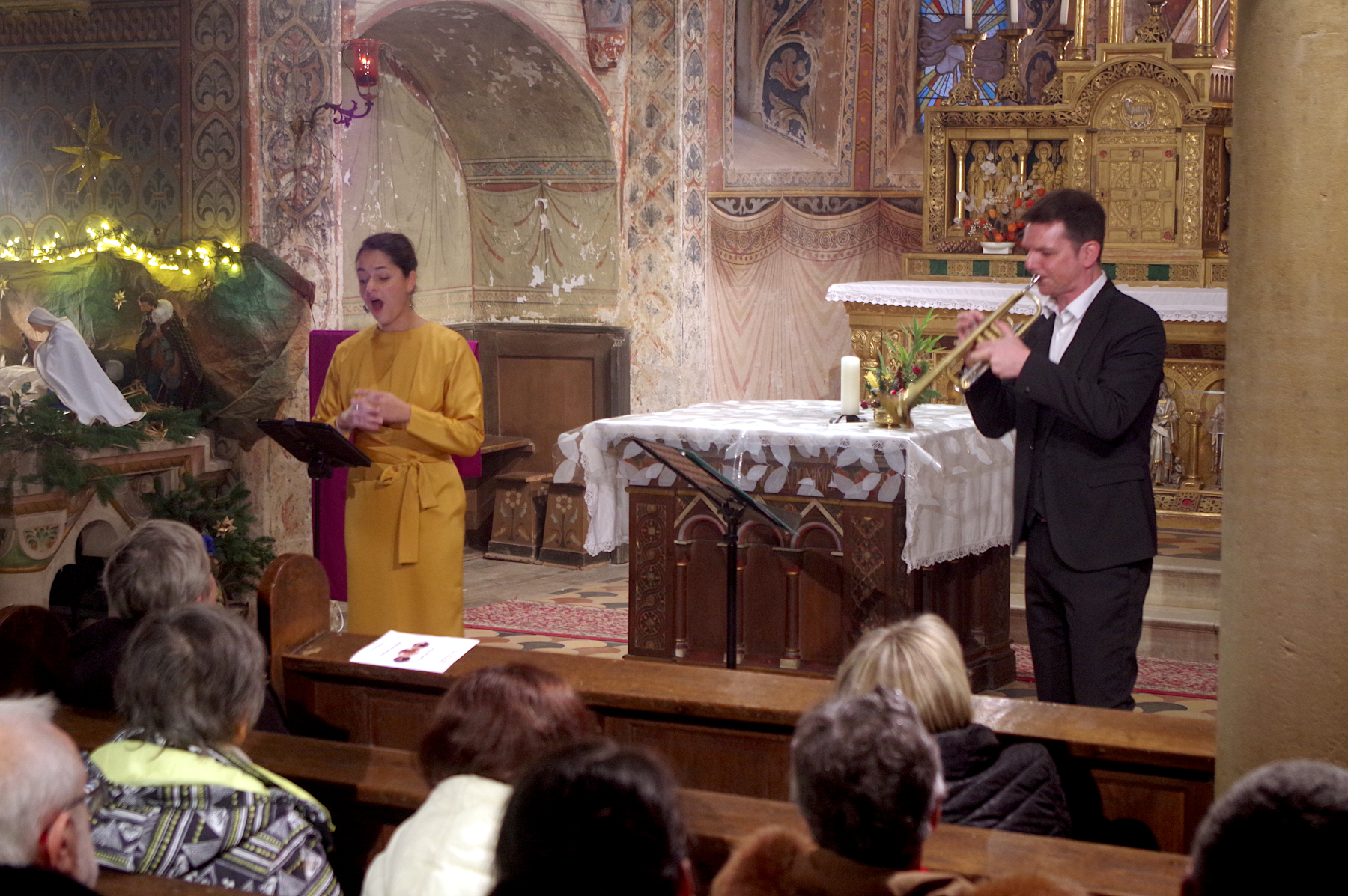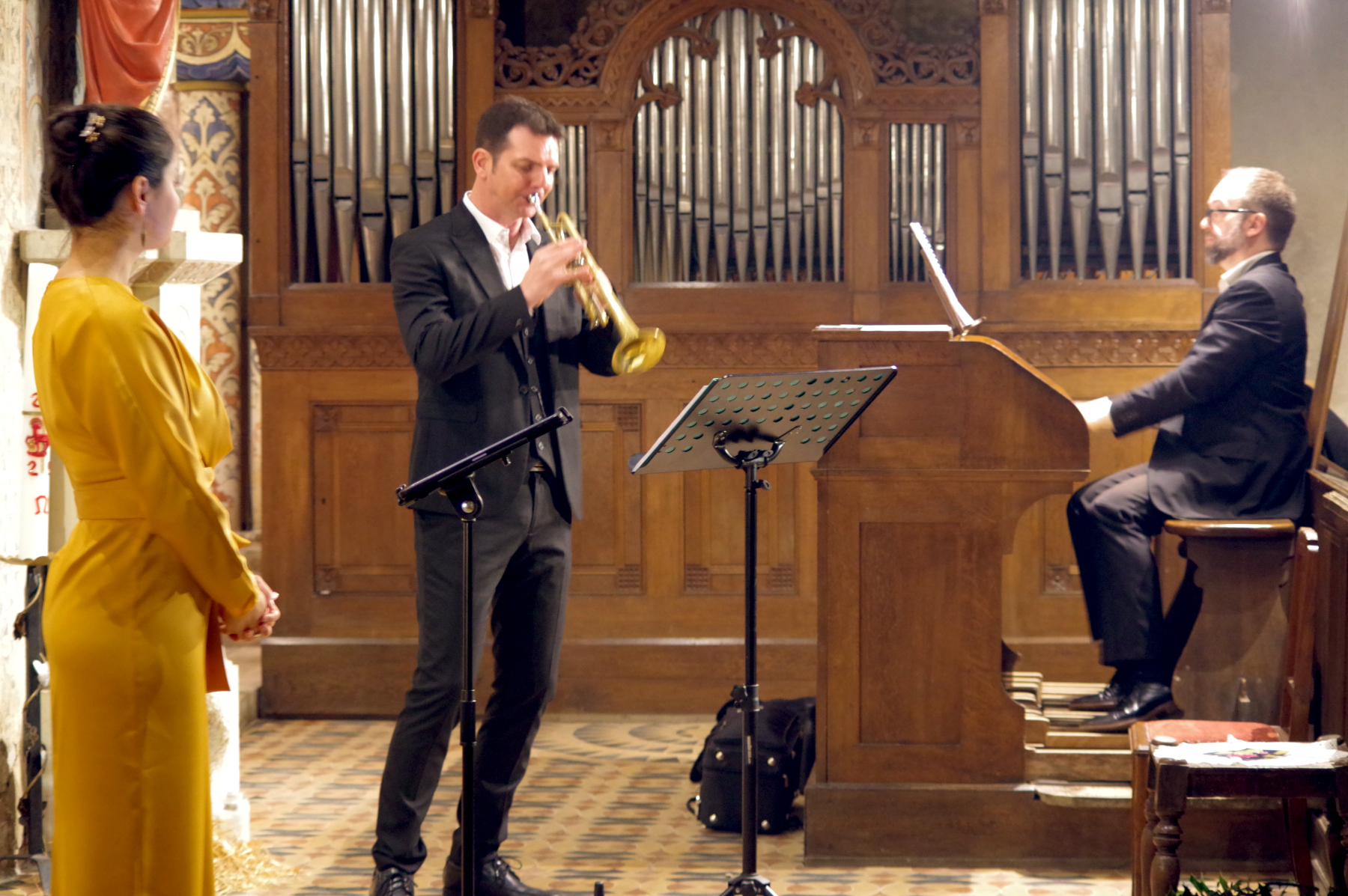 Après-midi de fête ce 7 décembre, où le Trio Cantus nous avait préparé un beau programme de l’Avent : un florilège de Noëls qu’on a tant plaisir à entendre, d’origine anglaise, française ou allemande, rassemblés en quatre suites autour du thème du vent, de la neige, de l’étoile, de la fête. La trompette de Mathieu Reinert, l’orgue Link joué par Christophe Durant et la voix de soprano de Mary-Lee Jacquier se sont mêlés pour notre plus grand plaisir dans un programme dont Christophe Durant avait fait les arrangements.
