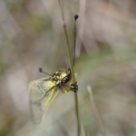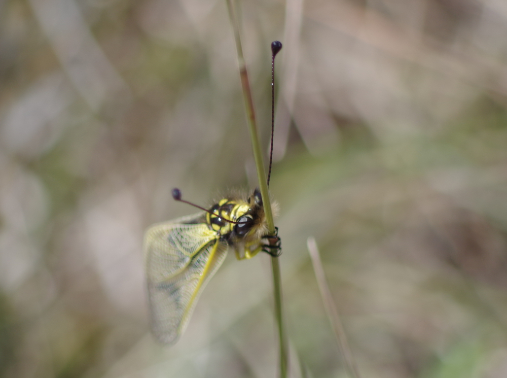 L’Ascalaphe fait penser à un papillon et vole comme une libellule mais les Ascalaphes constituent une famille propre.
