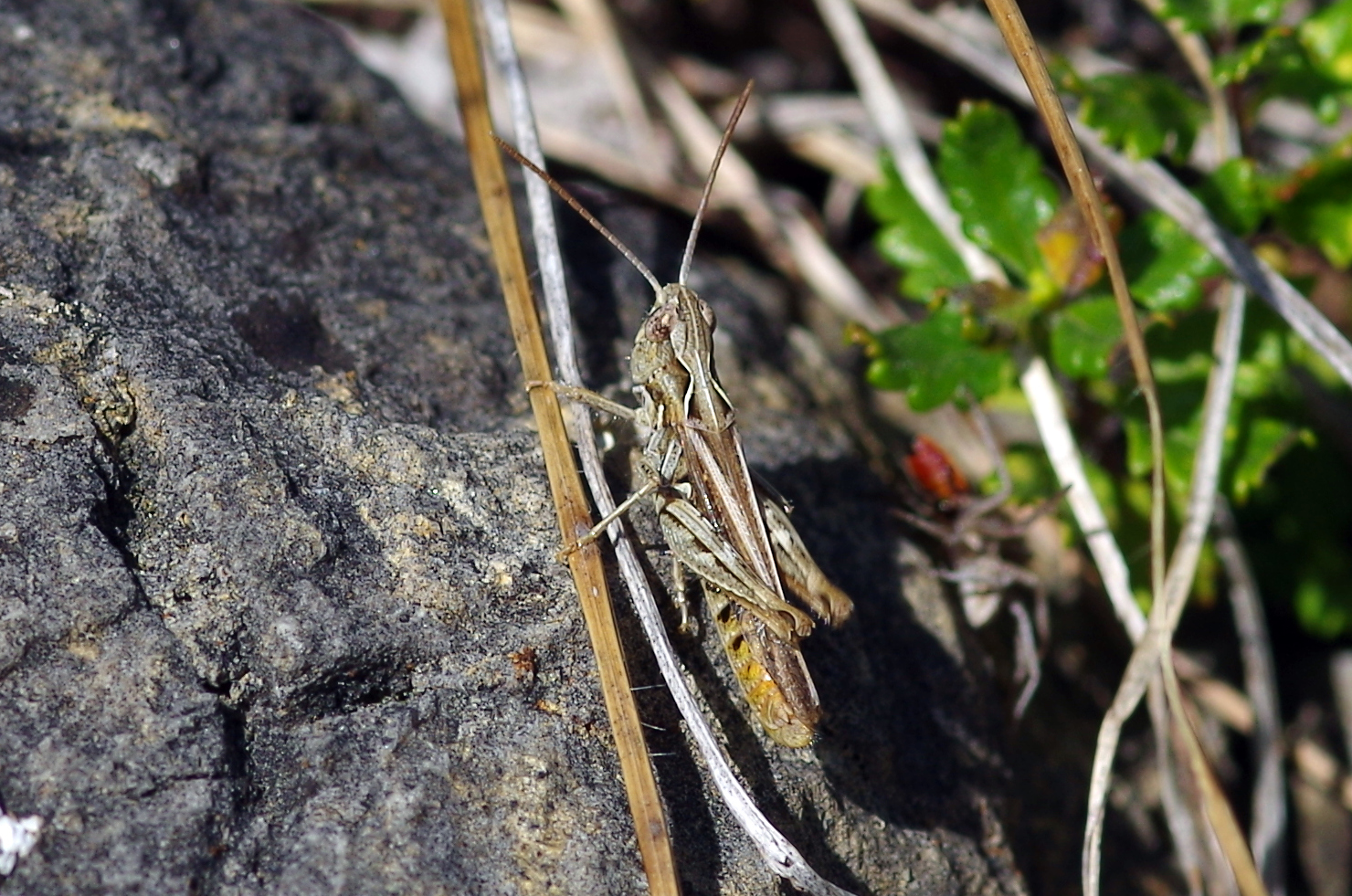 Criquet chanteur, sous-famille des Gomphocerinae ; Longueur : 12,5 à 14 mm pour le mâle, 17 à 19 mm pour la femelle ; Habitat : milieux arides à forts contrastes de température, pelouses rocailleuses, éboulis xériques, landes sablonneuses et friches calcaires, végétation rase et lacunaire