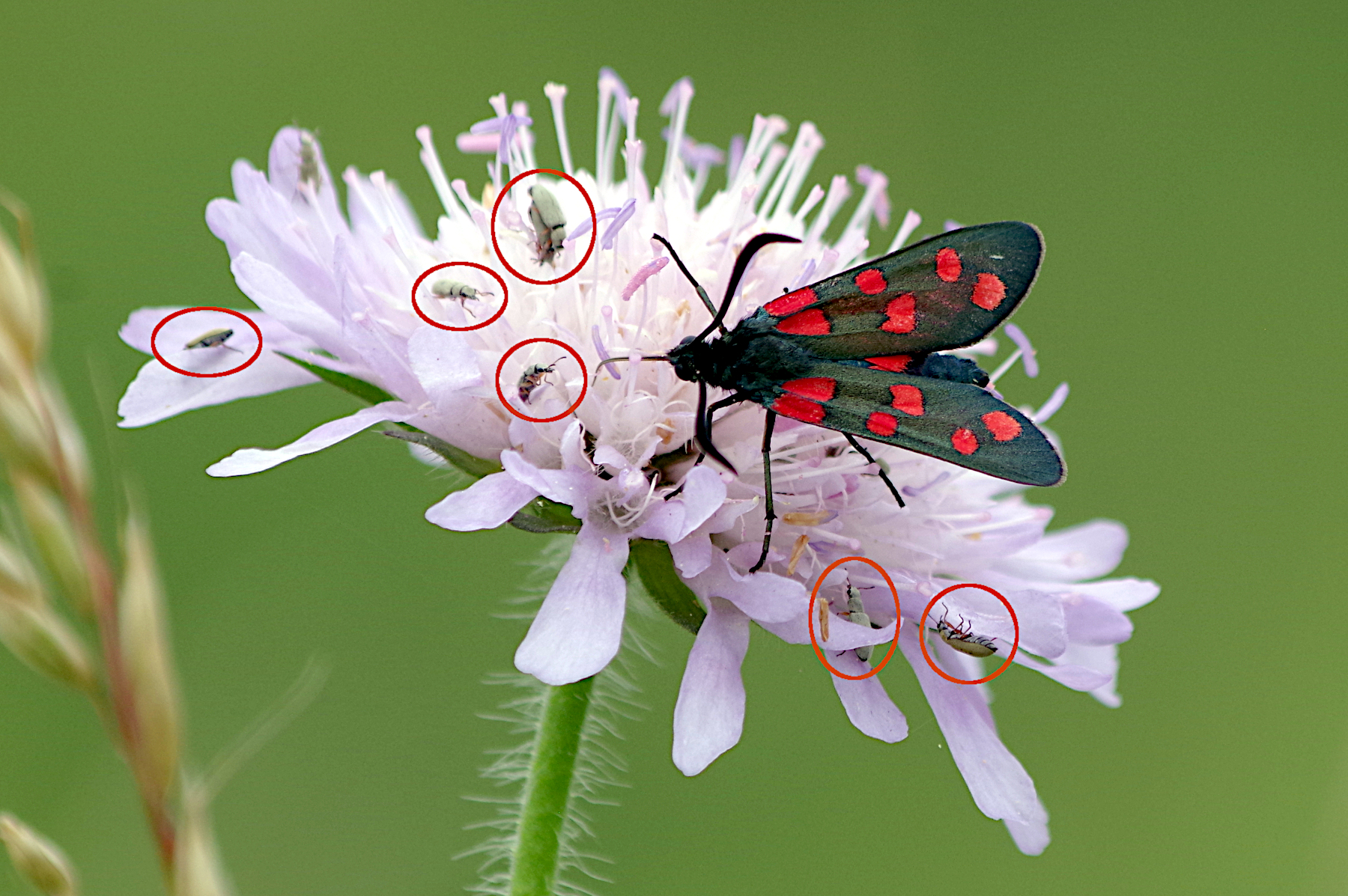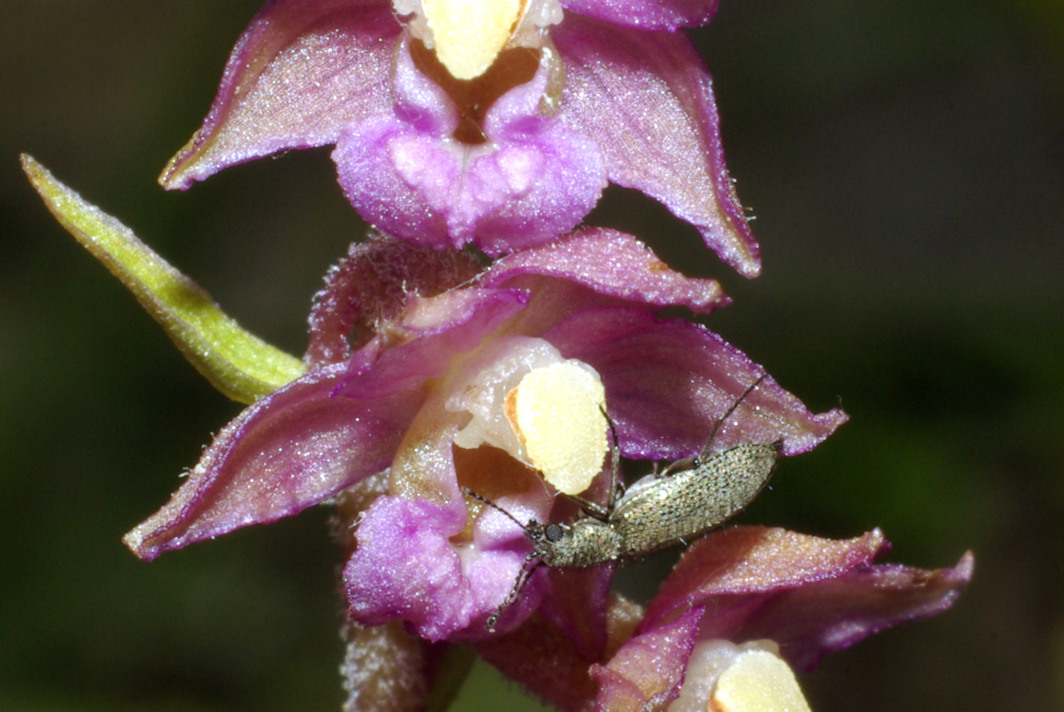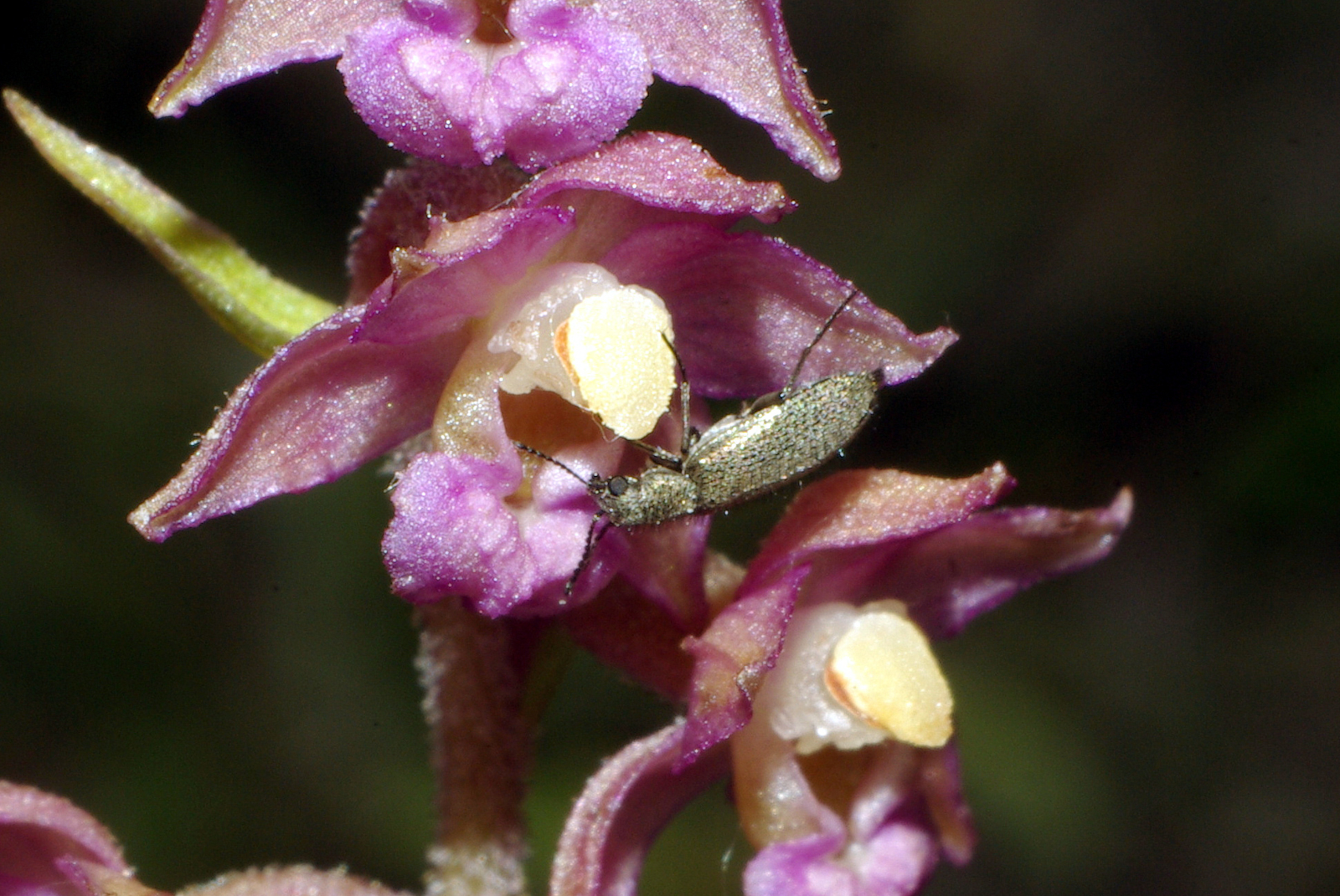 Il visite de nombreuses fleurs, parmi lesquelles des orchidées : dans les photos ci-dessous, sur Orchis pyramidal et Epipactis helléborine. Vu sa taille, on le découvre souvent dans un deuxième temps, d’abord attiré par une fleur ou un autre insecte plus gros. Puis, souvent, on en découvre plusieurs sur la même fleur.
