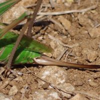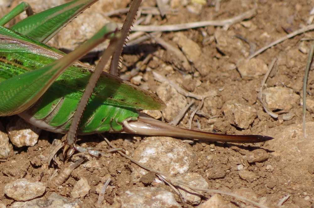 Le Dectique verrucivore est appelé communément Sauterelle à sabre : c’est le « sabre » impressionnant de la femelle qui est à l’origine de ce nom. En fait, c’est l’organe ovipositeur qui lui permet d’enfoncer ses œufs de quelques centimètres sous terre. Il est donc inoffensif.