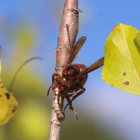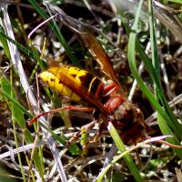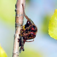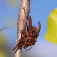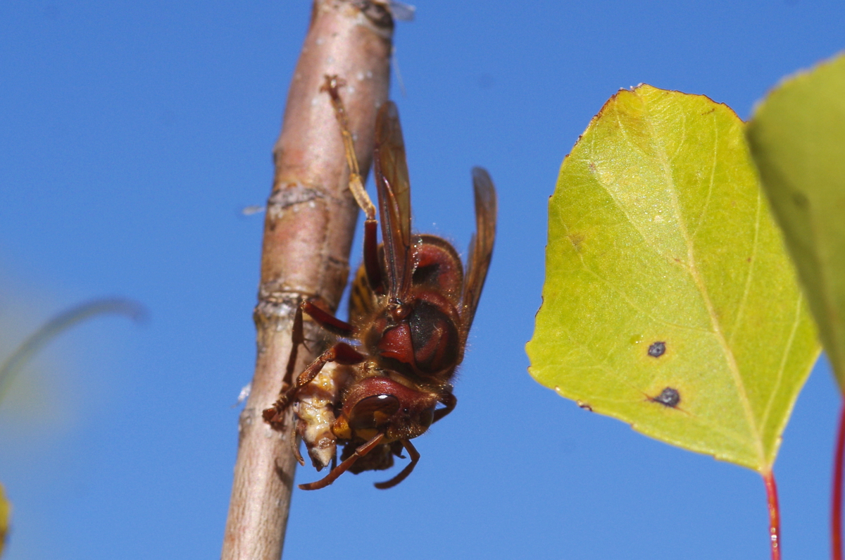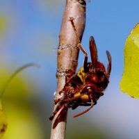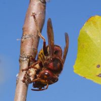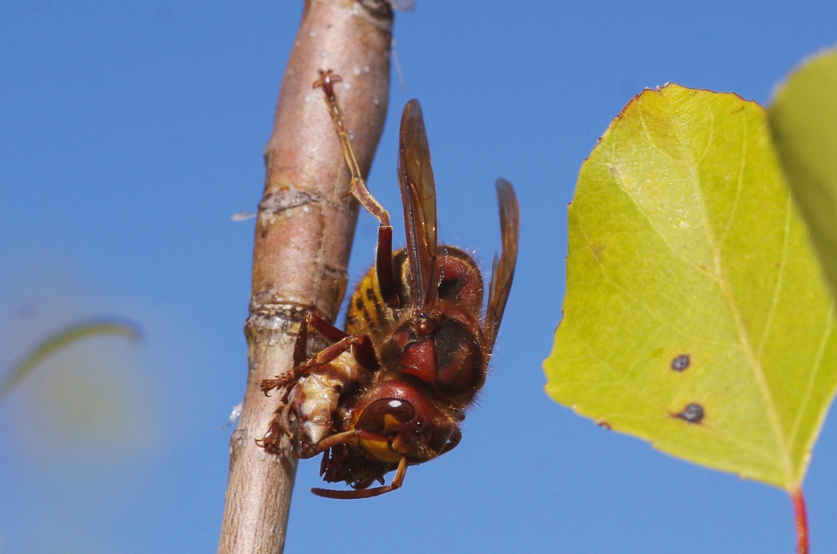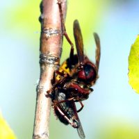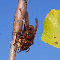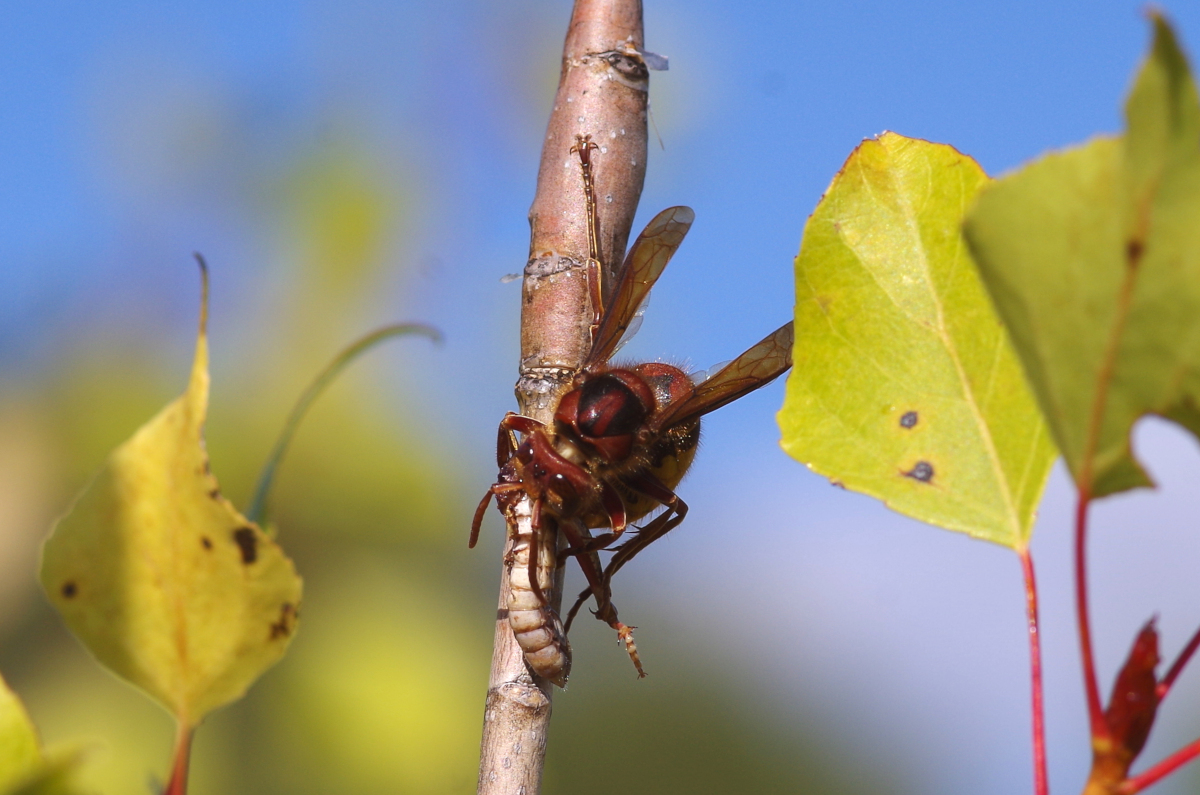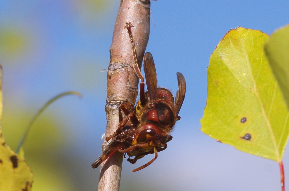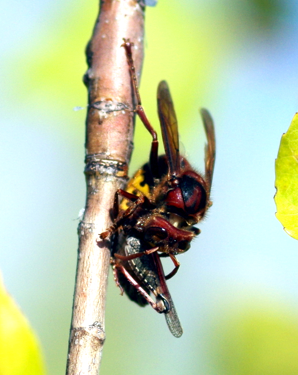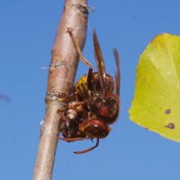Un frelon vient de capturer un criquet (photos et vidéo 10/09/2019). Il s’est posé sur une branche moins de trois minutes pour préparer sa proie puis s’est envolé sans doute pour l’apporter à son couvain :