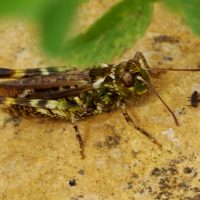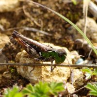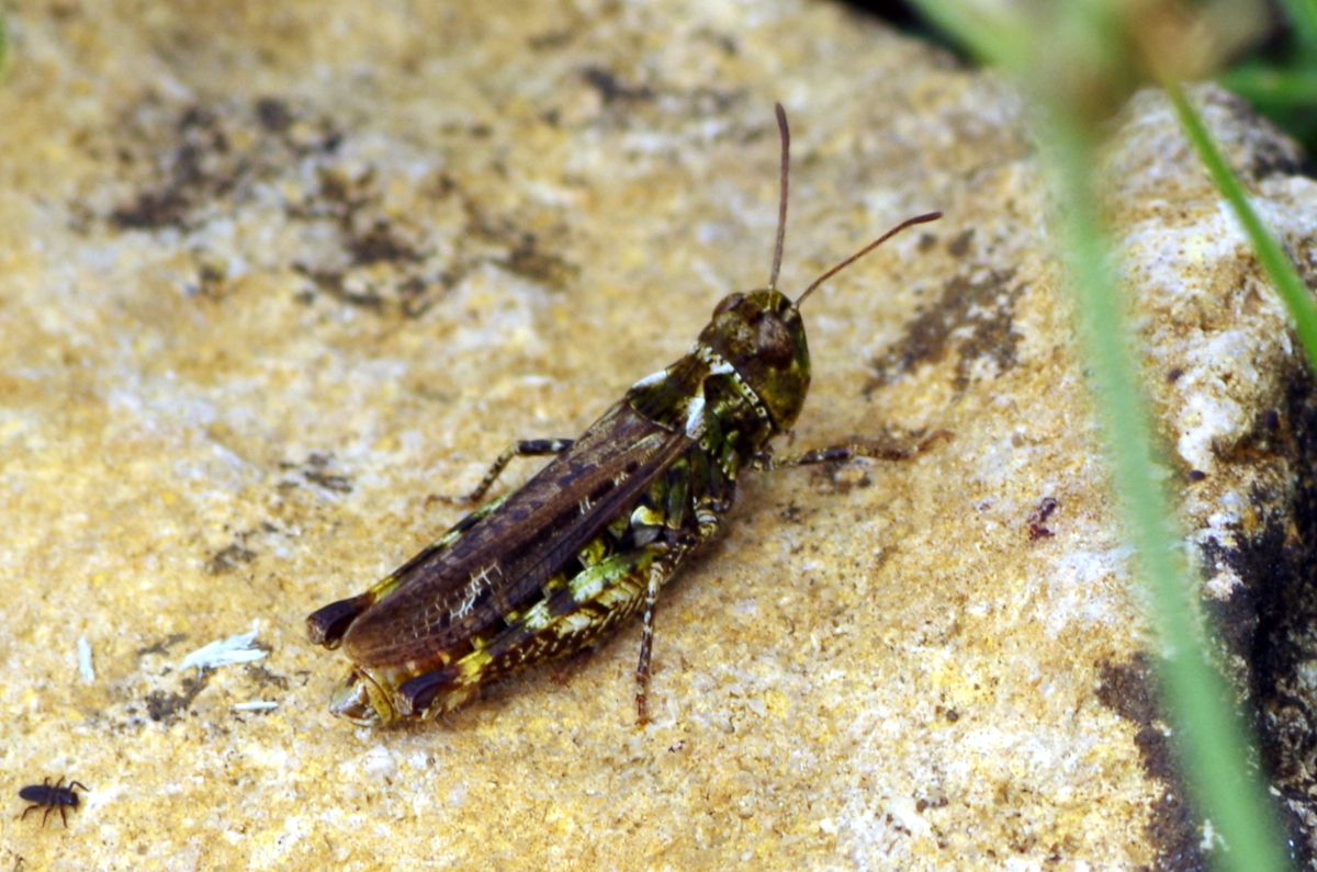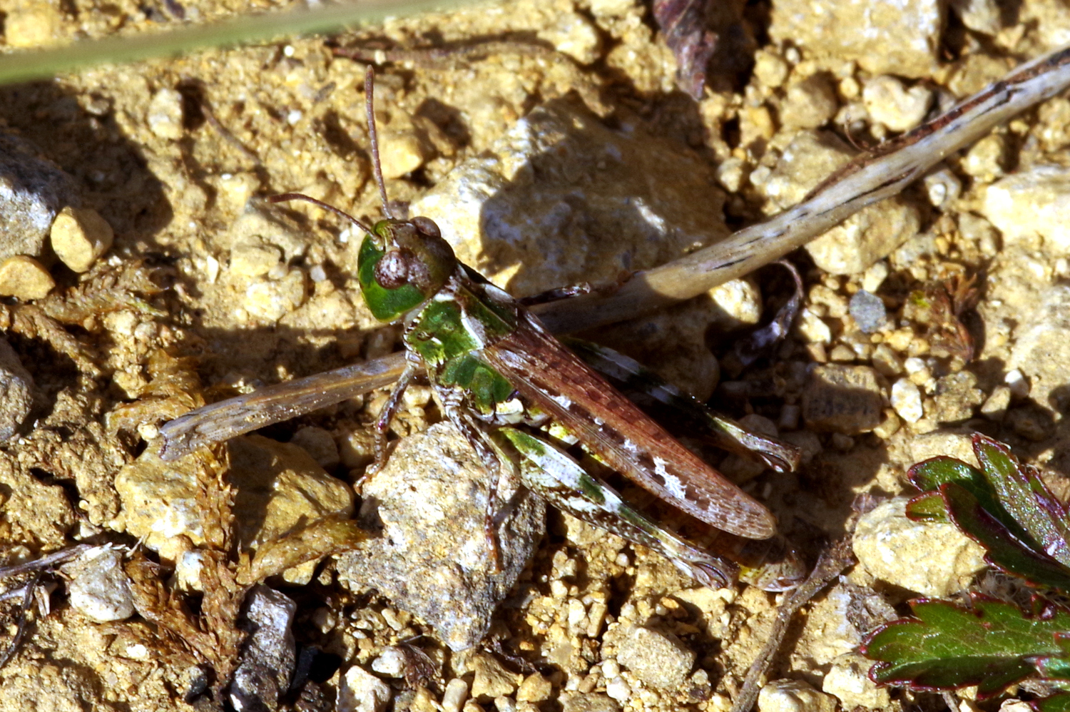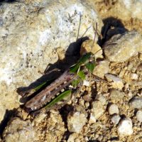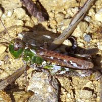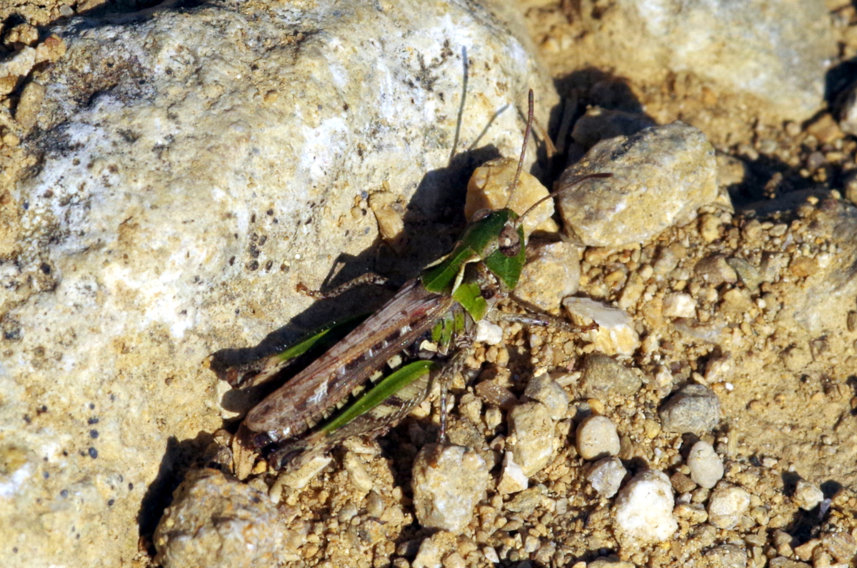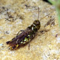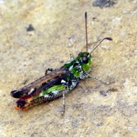 Criquet chanteur, sous-famille des Gomphocerinae ; Longueur : mâle 11-13 mm, femelle 12-17 mm ; Habitat : milieux secs et pauvres en végétation, landes, dunes, roches calcaires