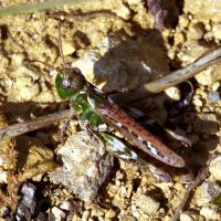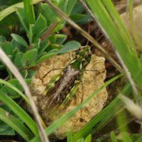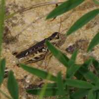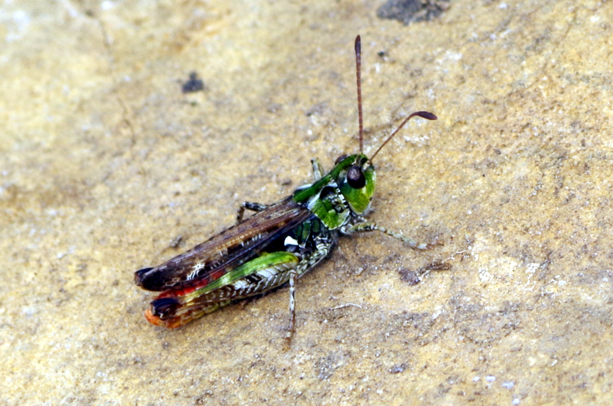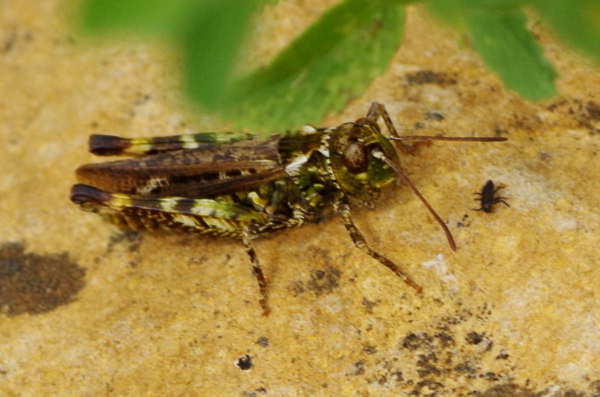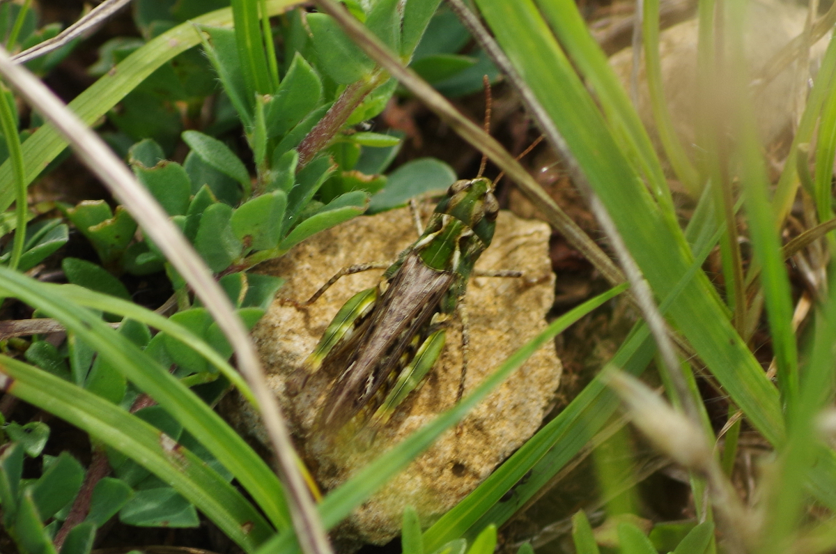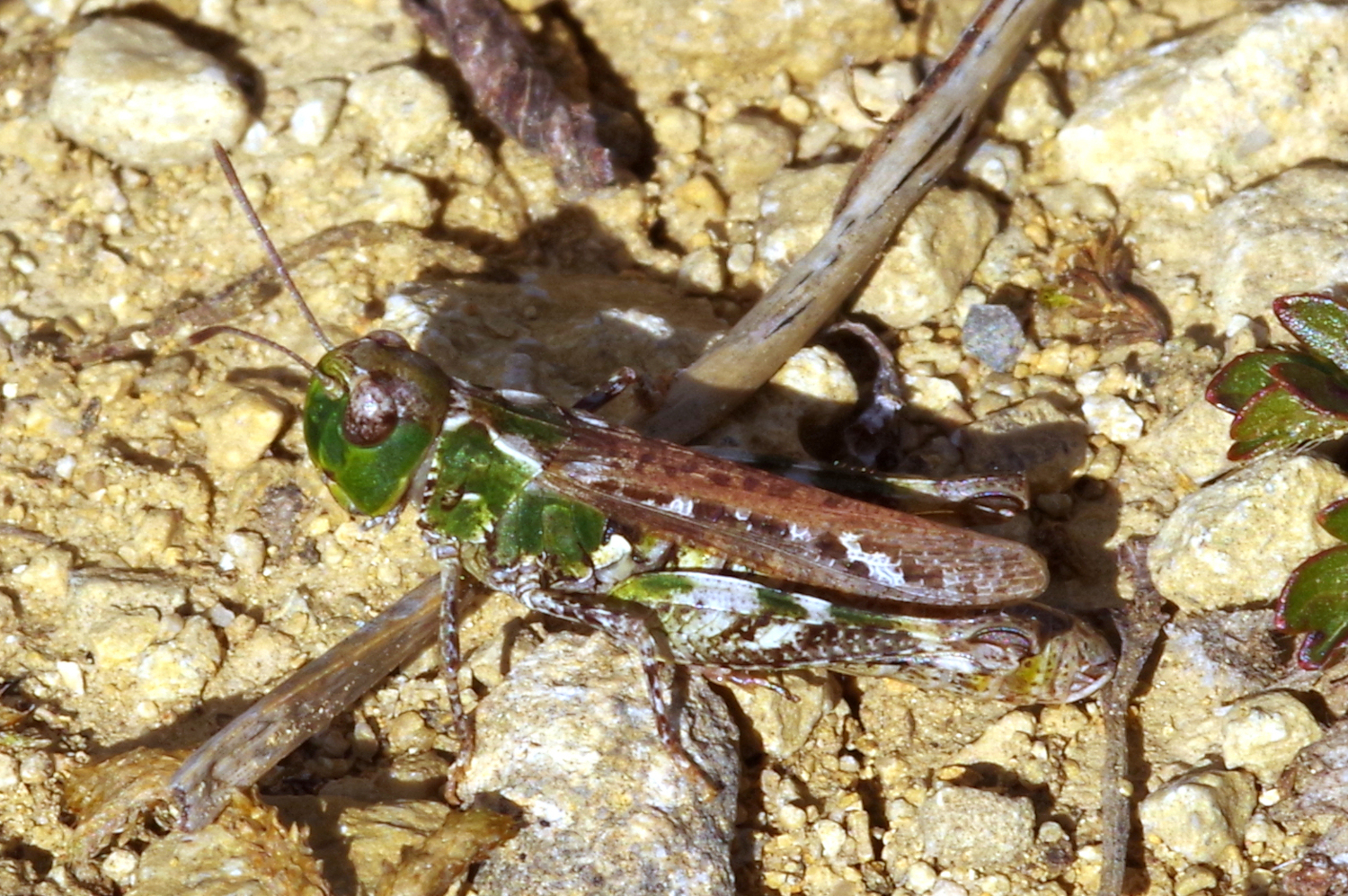 Criquet chanteur, sous-famille des Gomphocerinae ; Longueur : mâle 11-13 mm, femelle 12-17 mm ; Habitat : milieux secs et pauvres en végétation, landes, dunes, roches calcaires