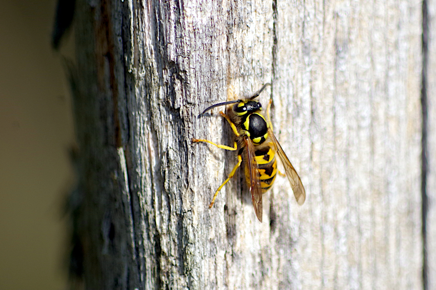 Guêpe germanique en train de prélever des fibres de bois sur un poteau – 01/10/2025