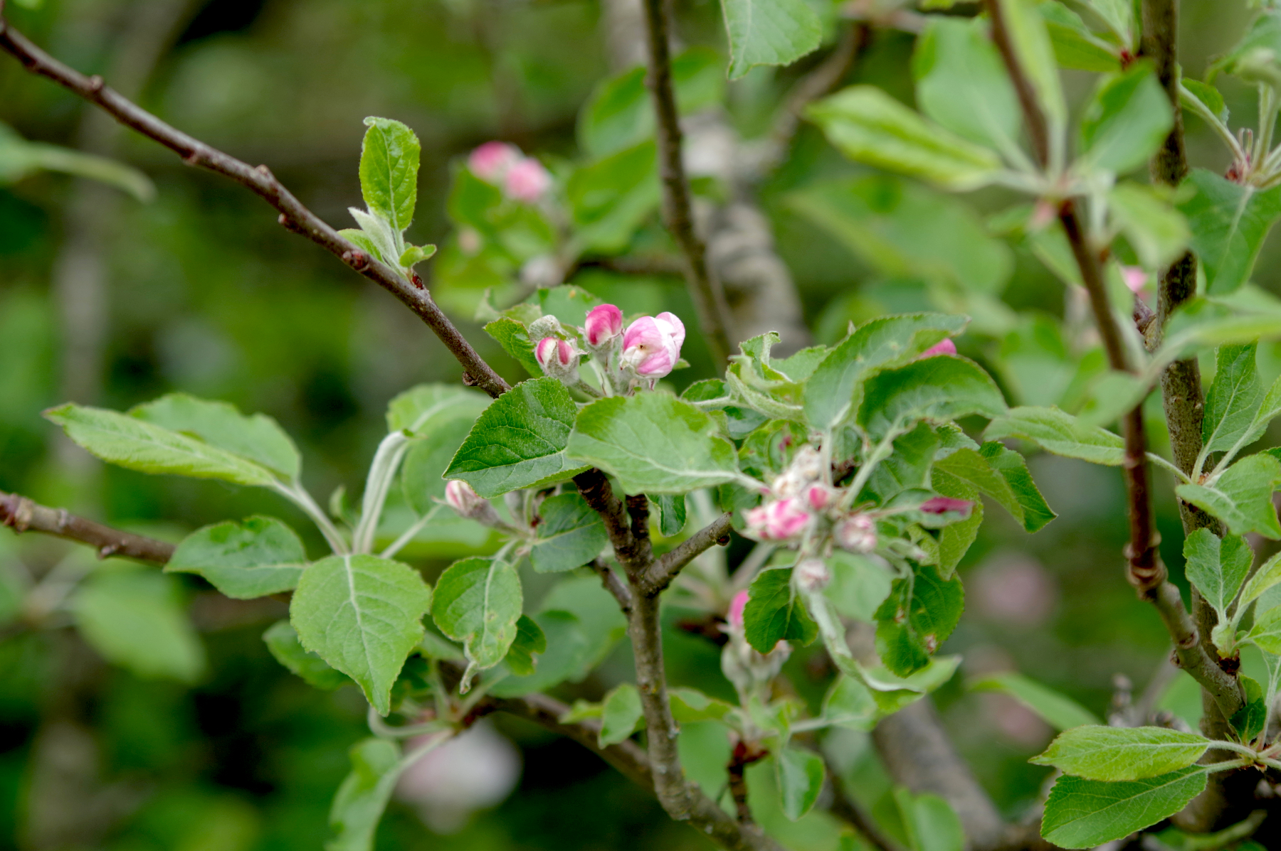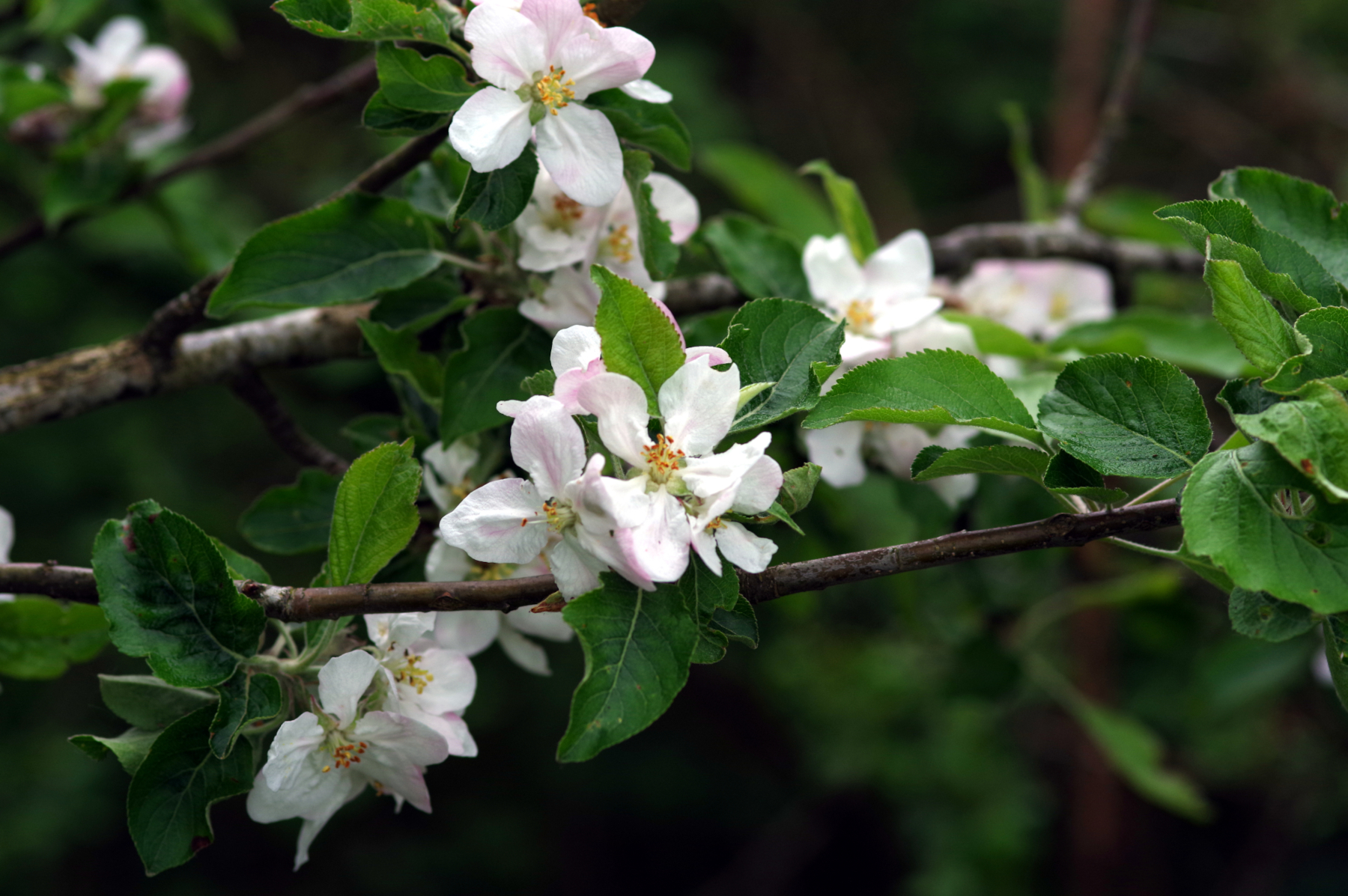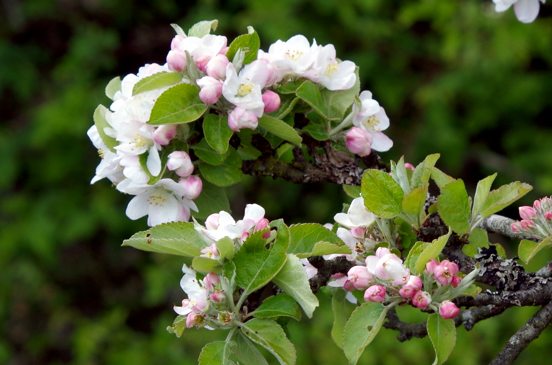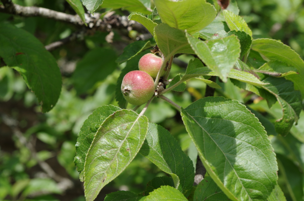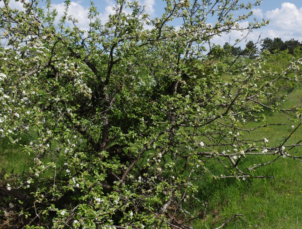 Pommier sauvage ou Pommier des bois, ce n’est pas l’ancêtre de nos pommiers cultivés qui viennent principalement d’une espèce d’Asie centrale. Sa silhouette est très irrégulière. Les fleurs sont roses en bouton puis blanches quand elles sont épanouies. Les pommes, vert-jaune, dures et très acides, sont petites (3-4 cm). Il peut être envahi par le Gui.