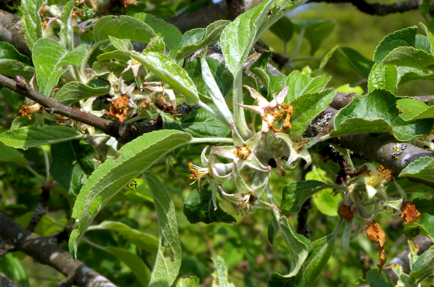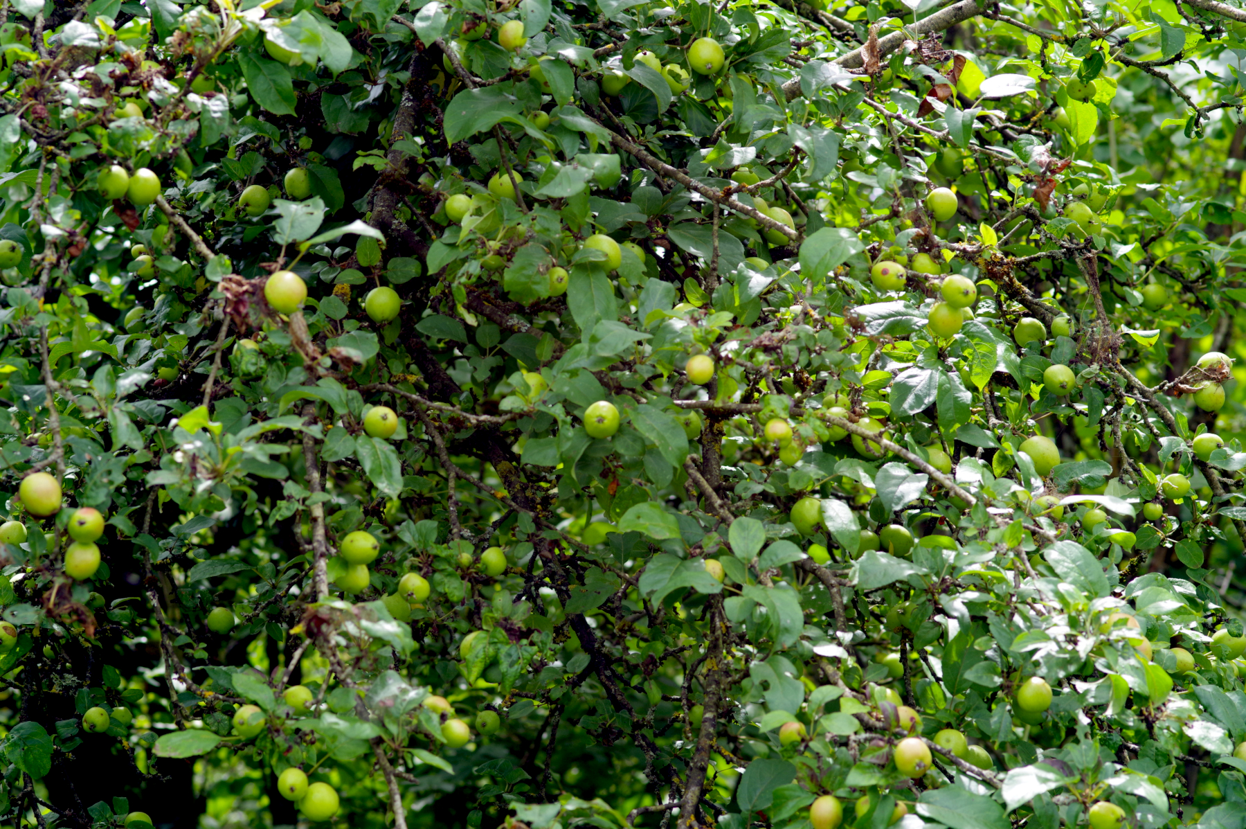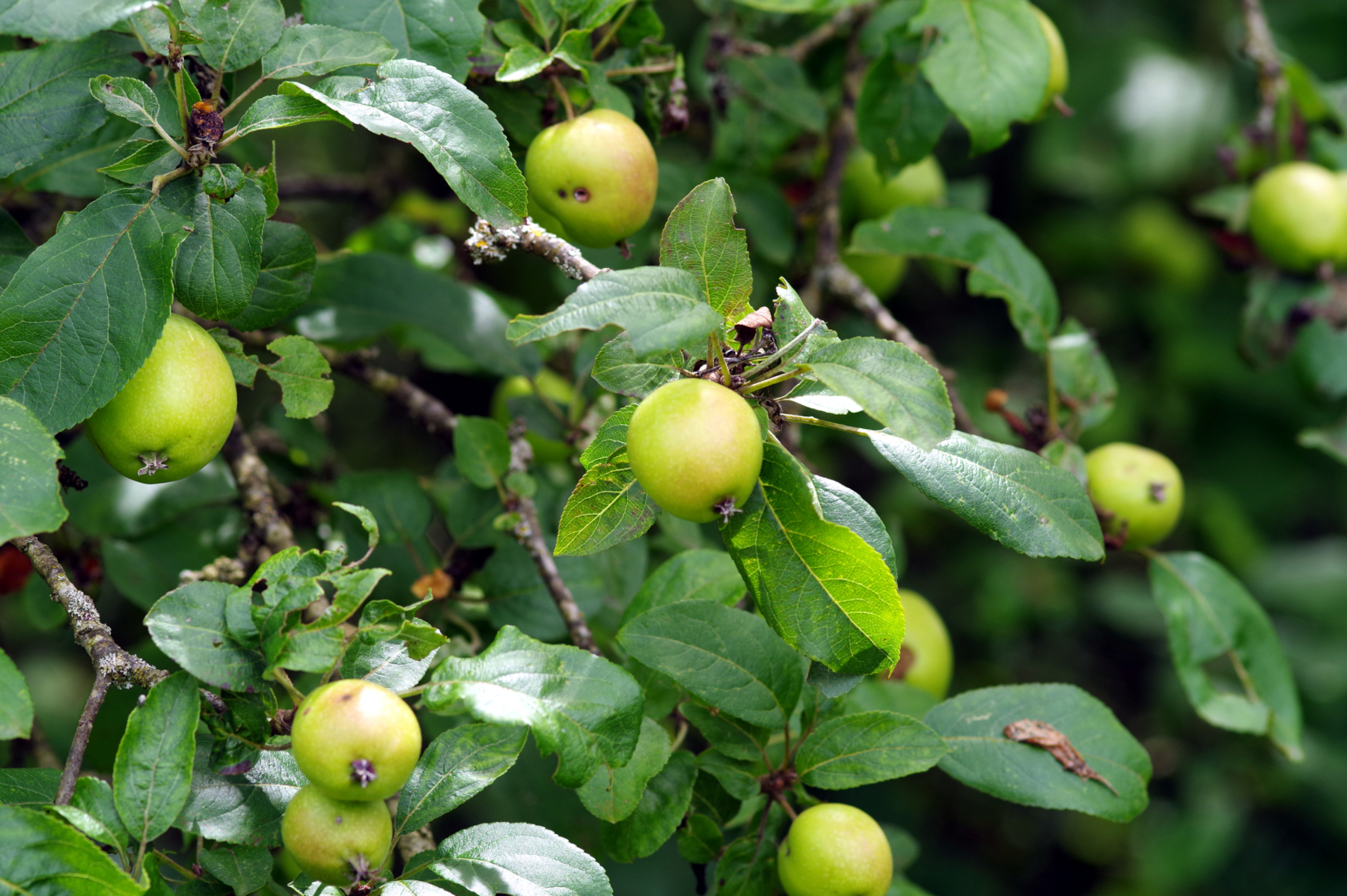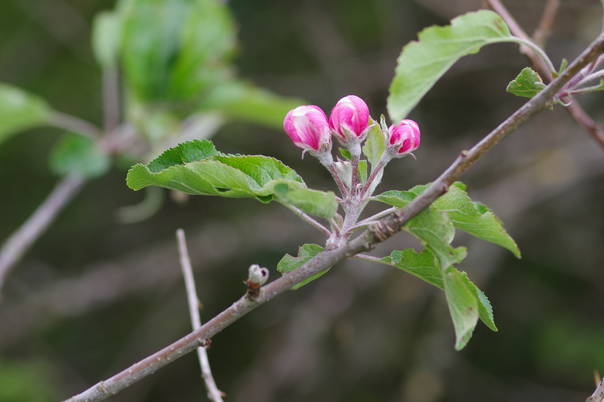 Pommier sauvage ou Pommier des bois, ce n’est pas l’ancêtre de nos pommiers cultivés qui viennent principalement d’une espèce d’Asie centrale. Sa silhouette est très irrégulière. Les fleurs sont roses en bouton puis blanches quand elles sont épanouies. Les pommes, vert-jaune, dures et très acides, sont petites (3-4 cm). Il peut être envahi par le Gui.