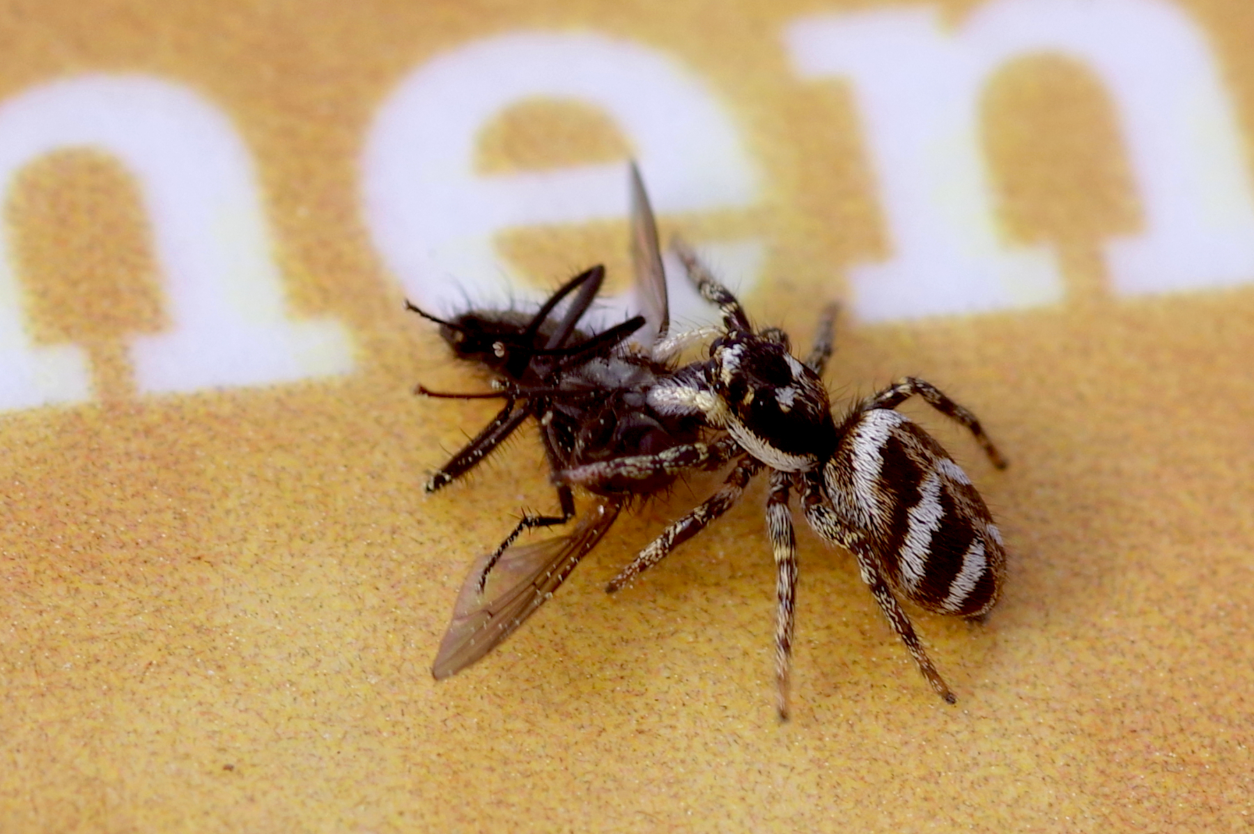 Sur la plupart des photos suivantes, cette araignée est sur un panneau pédagogique du sentier ou son support, où sont présentes aussi de nombreuses punaises de l’espèce Melanocoryphus albomaculatus, mais c’est un petit diptère (mouche) qui est ici la proie de Salticus scenicus.