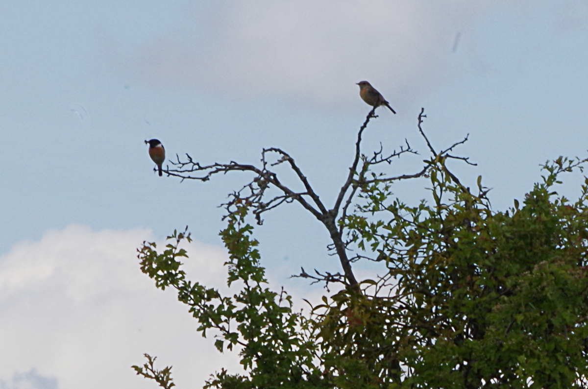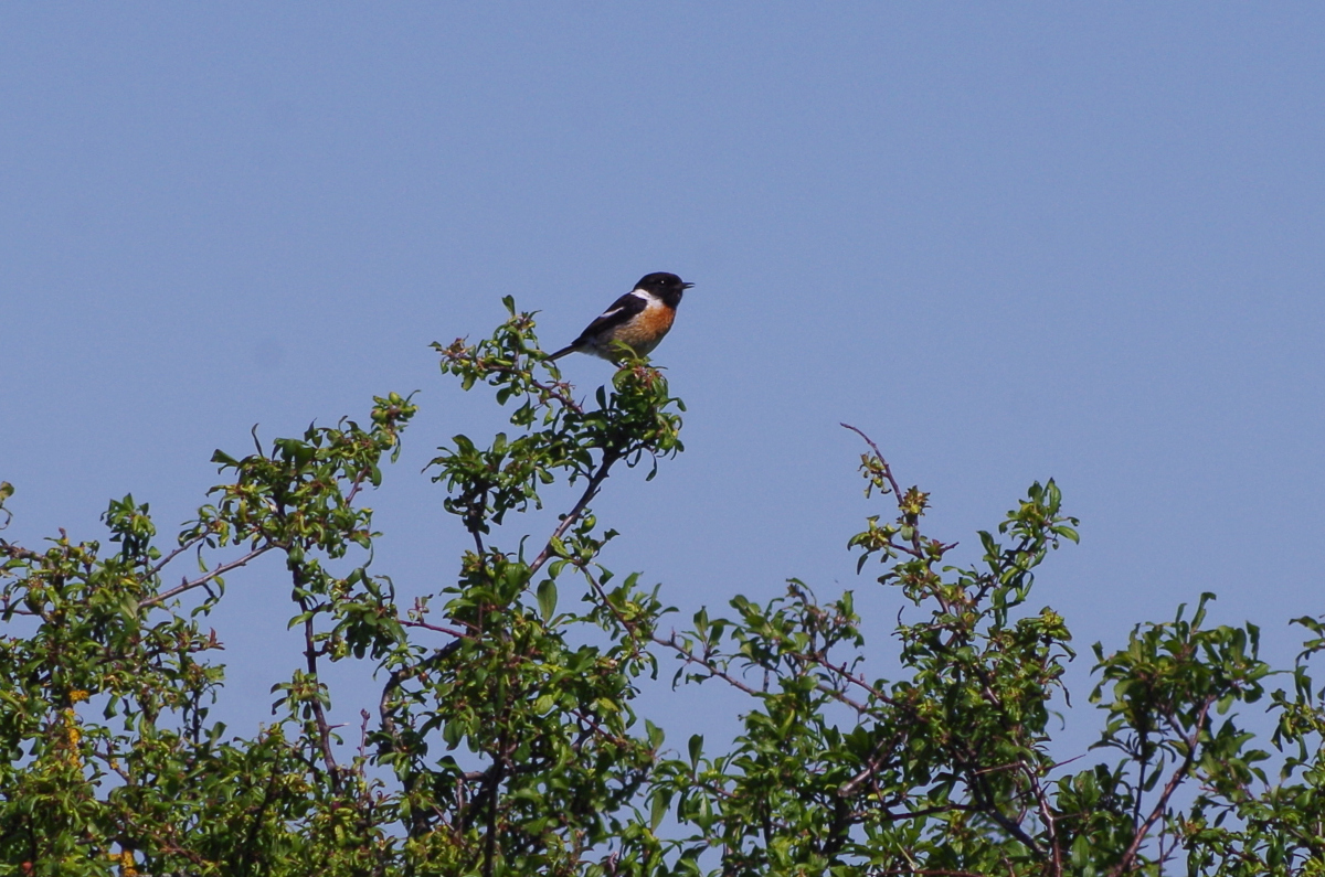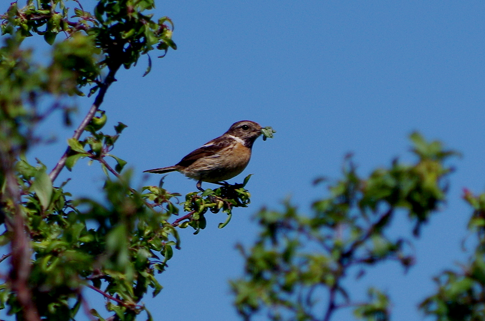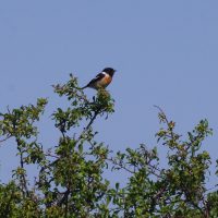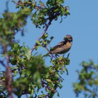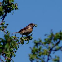 Toujours très inquiet sur son perchoir, le Tarier pâtre ne cesse d’émettre ses « uit tek tek » en agitant la queue au rythme de ses cris. Le Tarier pâtre vit en couple ; les deux parents veillent au nourrissage et à la sécurité de ses petits.